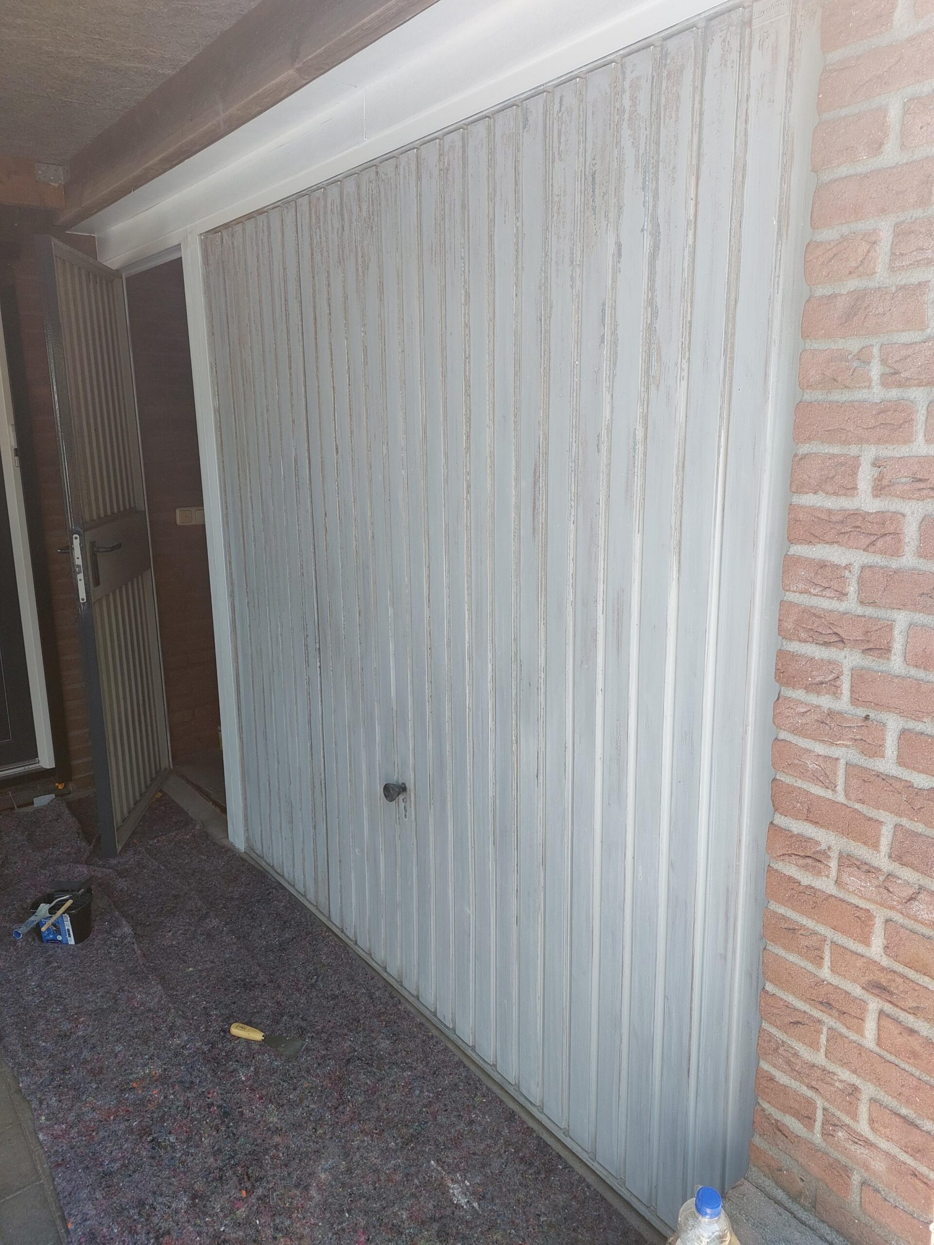 Verf die aan het afpellen is? Dat kan natuurlijk niet. door wat schuurwerk en een mooi nieuw lakje eroverheen is deze garage deur zo goed als nieuw.